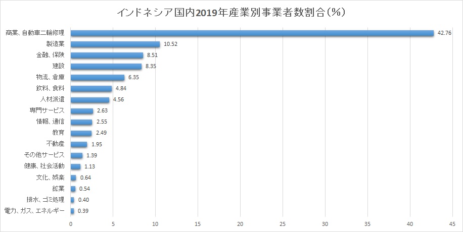 2019年のインドネシア国内産業別事業者数割合を示したグラフを見ると、商業分野が過半数を占めていることが判ります。