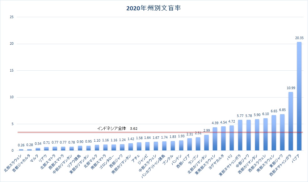 2020年の州別文盲率グラフでは全国平均が3.62%で、昨今では毎年0.1%前後の割合で改善されています。