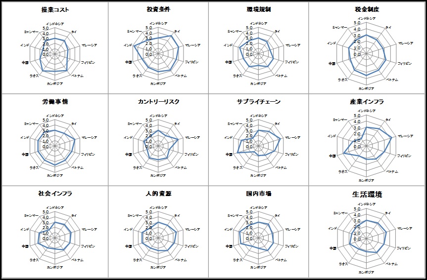 現地視察やセミナー、そしてインターネットで得られた情報を基に、インドネシア、タイ、マレーシア、フィリピン、ベトナム、カンボジア、ラオス、中国、インド、ミャンマーを対象に、試してみたのが下記のレーダーチャートです。